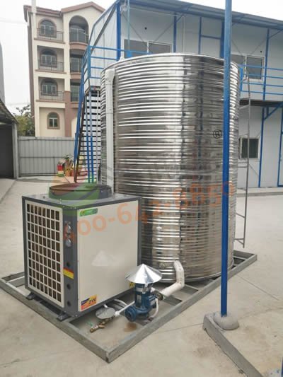 KFXRS-17II 浩通能商用空氣能主機1臺,5噸圓形不銹鋼保溫水箱1個、熱水循環泵、熱水增壓泵各1個及相關配套設施——為商用空氣能整體機一套